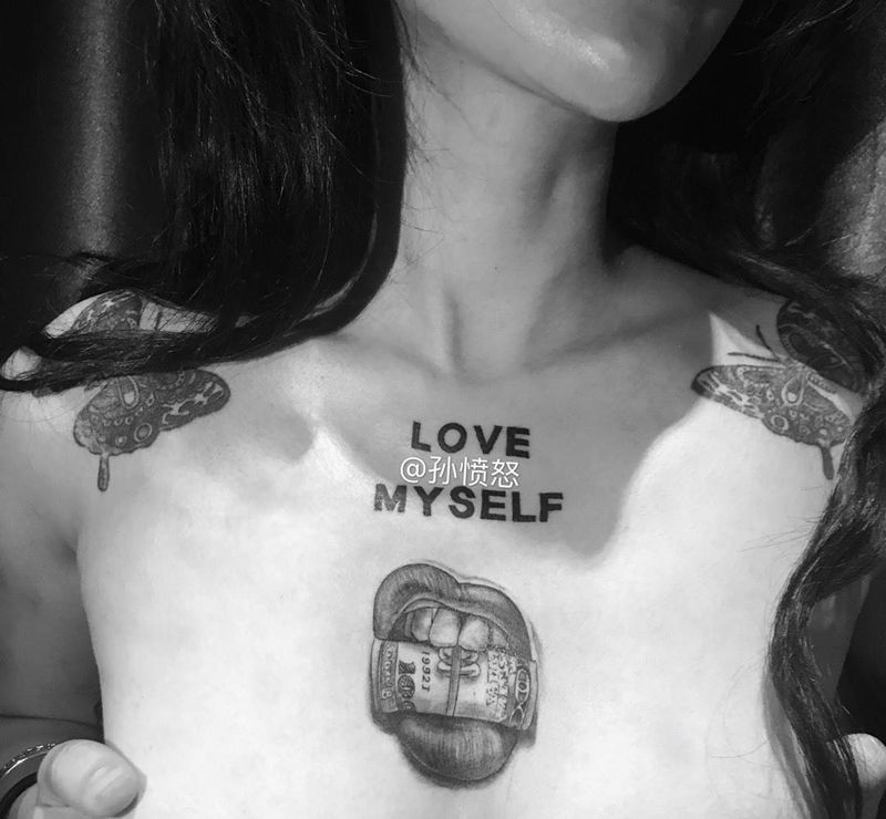 LOVE+$嘴唇纹身图片_成品胸部写实英文纹身图案