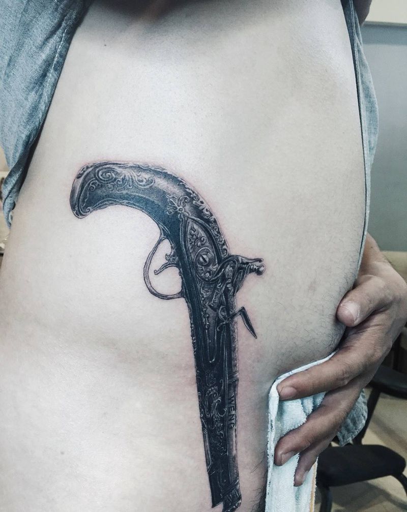 当前位置: 首页 >广东省江门市纹身店-12TATTOO纹身图案>火炮纹身图片_成品腹部欧美写实静物纹身图案