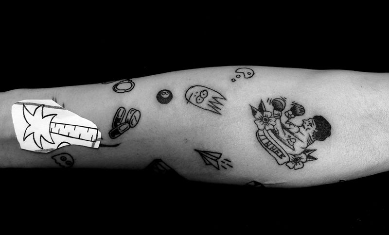 拼图(花臂)纹身图片_手臂新传统点刺小图纹身图案