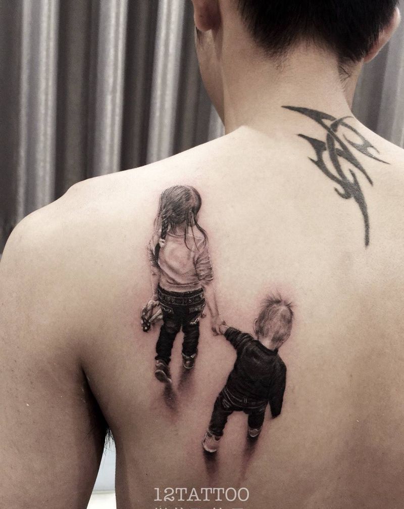 父爱如山纹身图片_肩部成品写实人物纹身图案