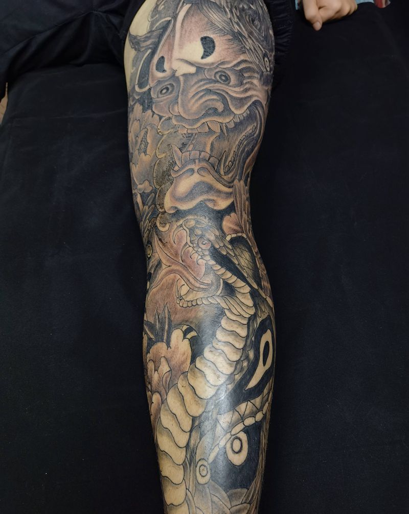 • T网红王老大花腿龙纹身图片_腿部新传统纹身图案
