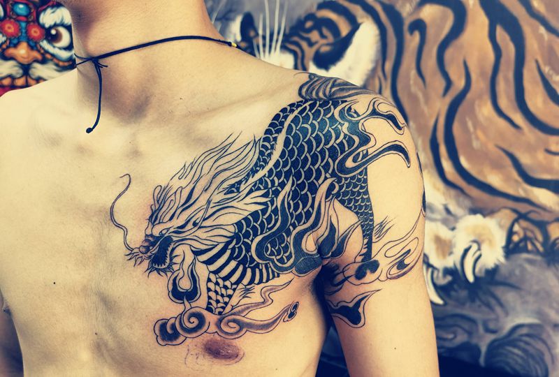 麒麟纹身图片_胸部肩部老传统纹身图案