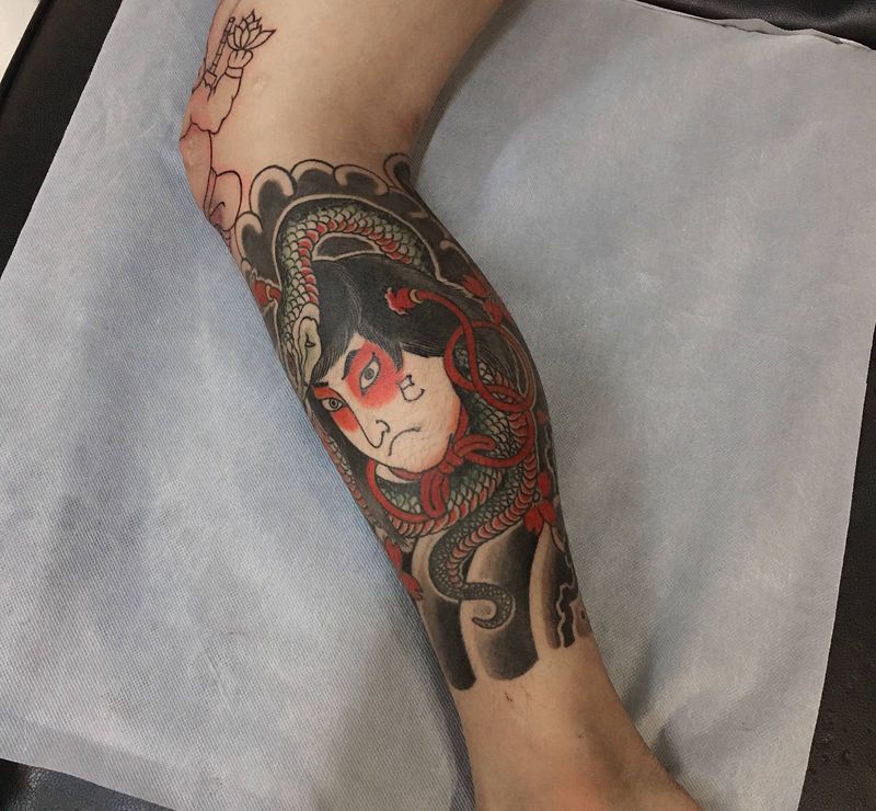 老传统包小腿纹身图片_脚部腿部老传统新传统达摩蛋蛇彩色纹身图案