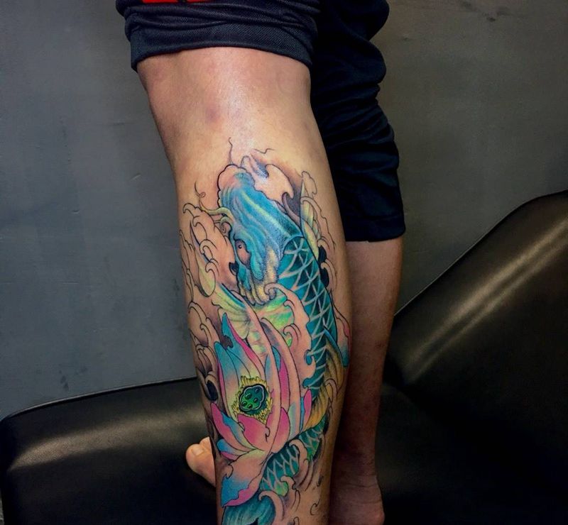 • T网红王老大花腿龙纹身图片_腿部新传统纹身图案