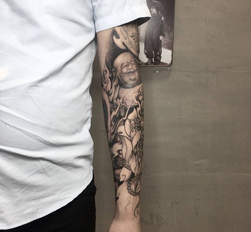 当前位置: 首页 >广东省江门市纹身店-安刺青纹身图案>不动尊弥勒花臂拼接纹身图片