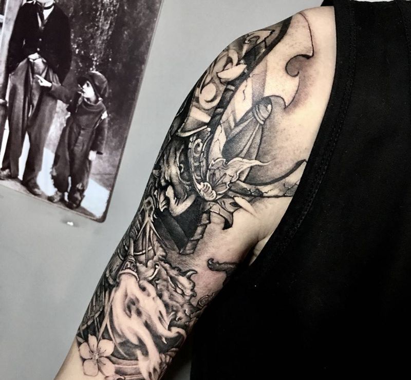 大臂鬼武士遮盖纹身图片_手臂鬼武士遮盖纹身图案