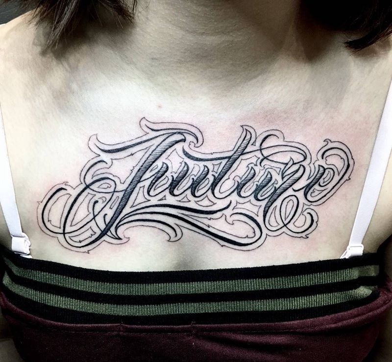 未来纹身图片_胸部花体字纹身图案