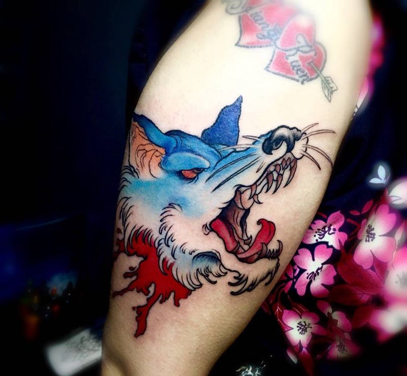 当前位置: 首页 >广东省江门市纹身店-安刺青纹身图案>狼头纹身图片_手臂New School狼头彩色纹身图案