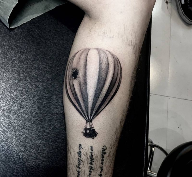 忆纹身图片_腿部欧美写实热气球爆炸回忆纹身图案