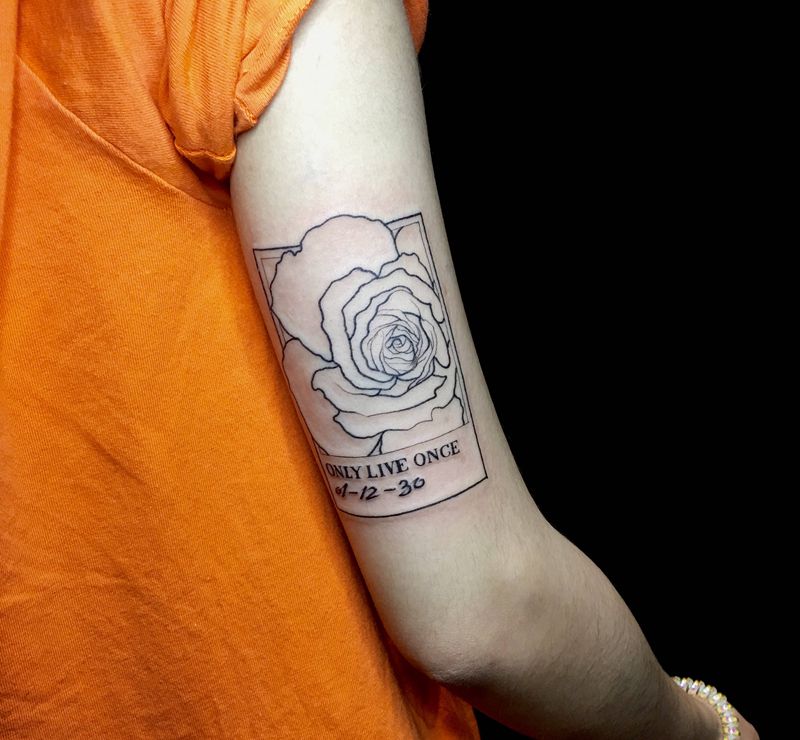 玫瑰纹身图片_手臂几何玫瑰英文日期纹身图案
