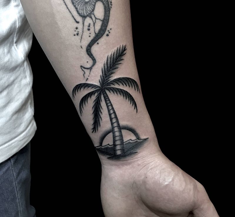 椰子树纹身图片_手臂手部Old School椰子树黑灰纹身图案
