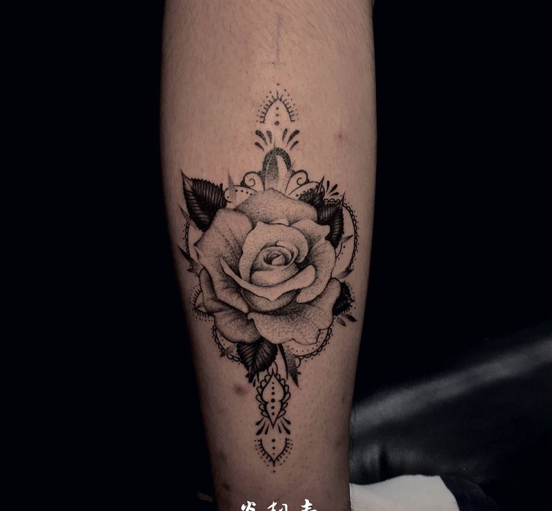 碰撞纹身图片_腿部脚部点刺图腾玫瑰繁花混搭纹身图案