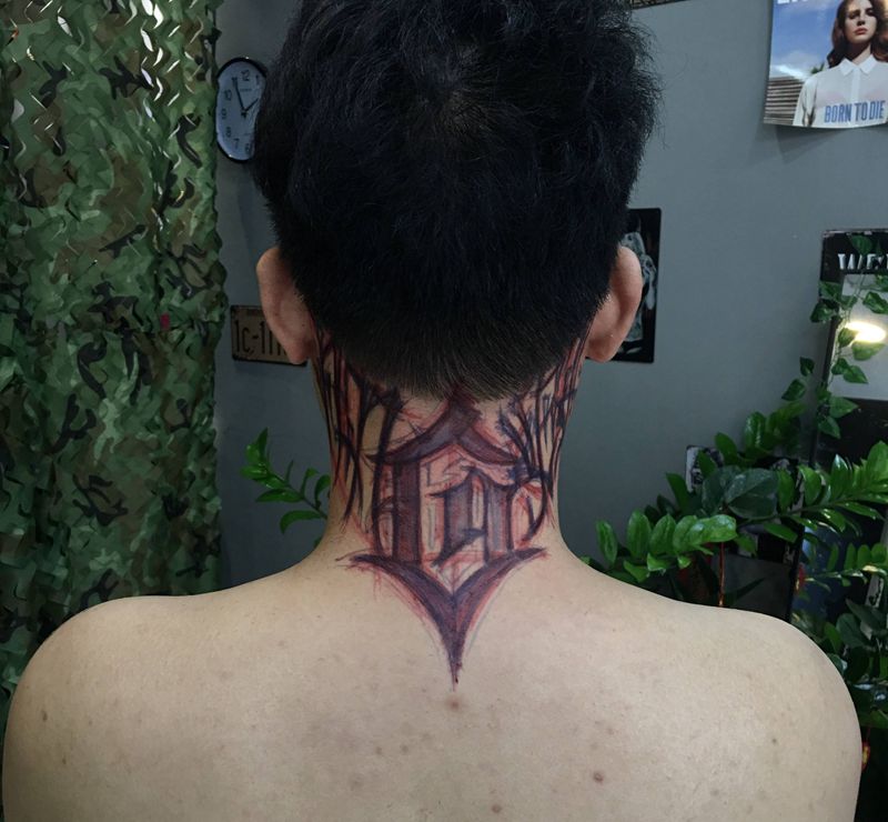 当前位置: 首页 >广东省江门市纹身店-安刺青纹身图案>愤怒纹身图片_颈部肩部花体字图腾暗黑英文脖子纹身图案