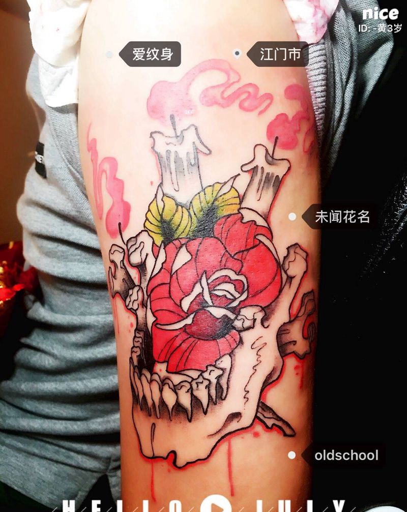 当前位置: 首页 >广东省江门市纹身店-诺刺青纹身工作室纹身图案>骷髅与花纹身图片_手臂Old School纹身图案