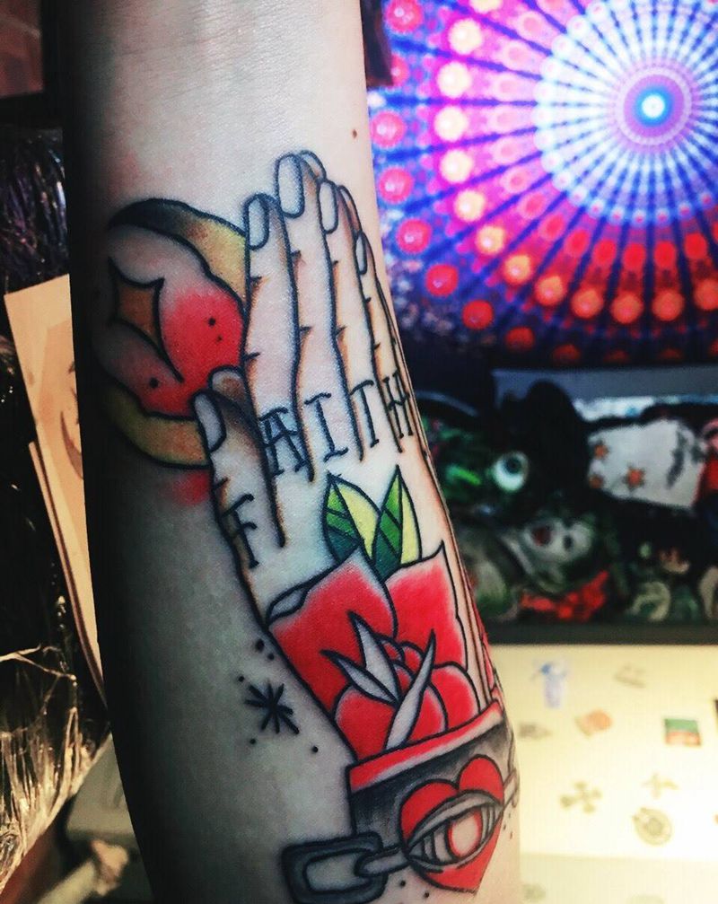 当前位置: 首页 >广东省江门市纹身店-诺刺青纹身工作室纹身图案>祈祷之手纹身图片_手臂Old School纹身图案
