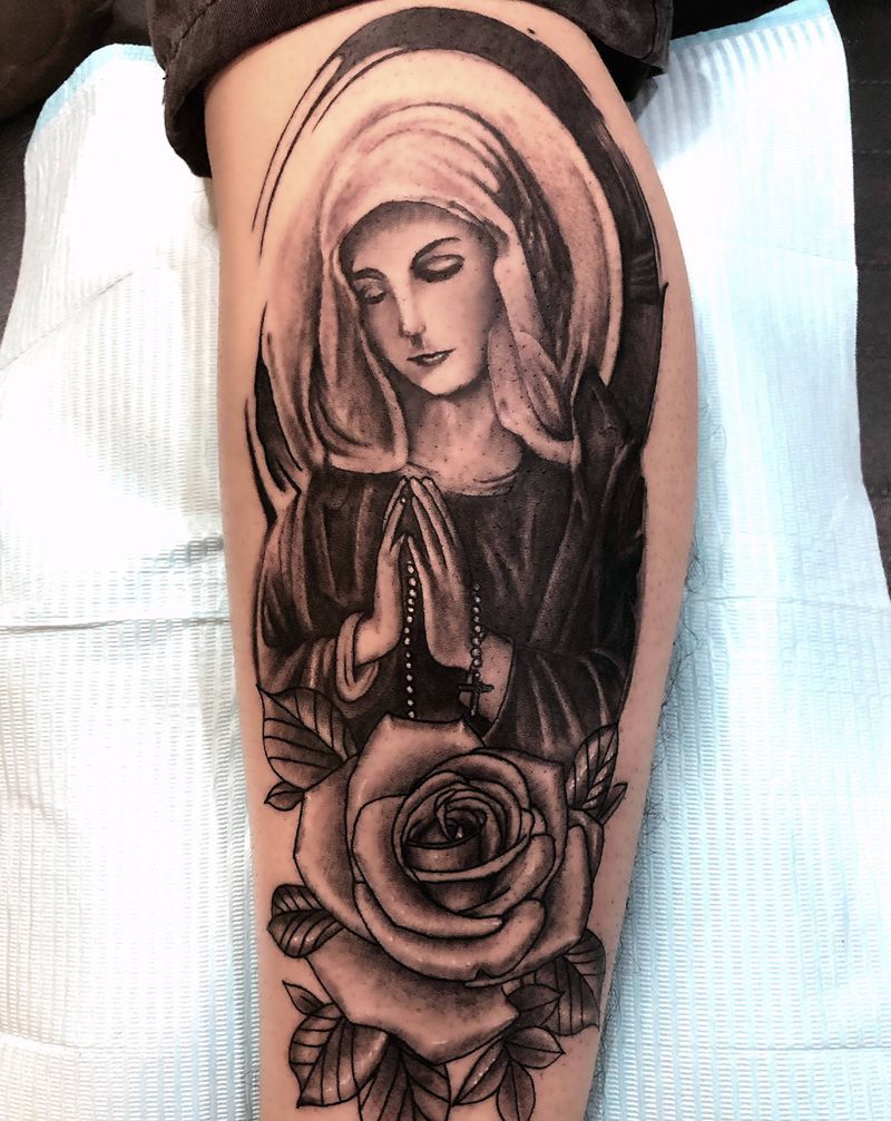 欧美写实圣母纹身图片_腿部欧美写实纹身图案