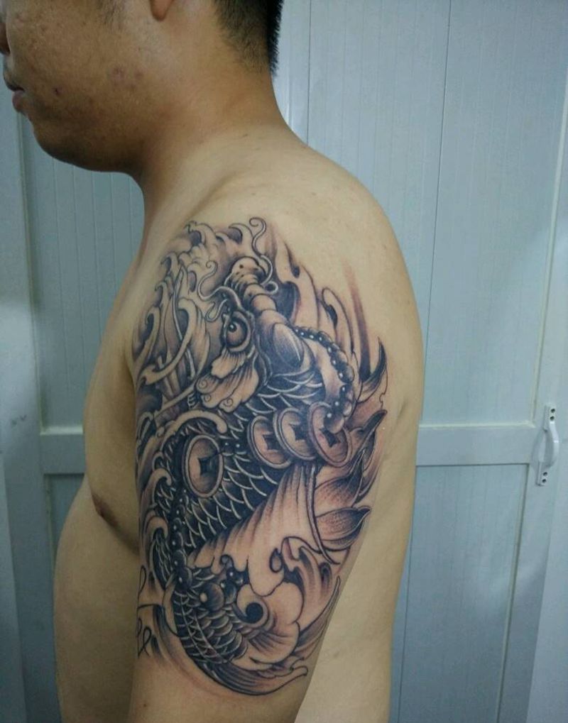 当前位置: 首页 >广东省佛山市纹身店-乐意纹身纹身图案>招财锦鲤纹身图片_肩部手臂手部传统动物成品纹身图案
