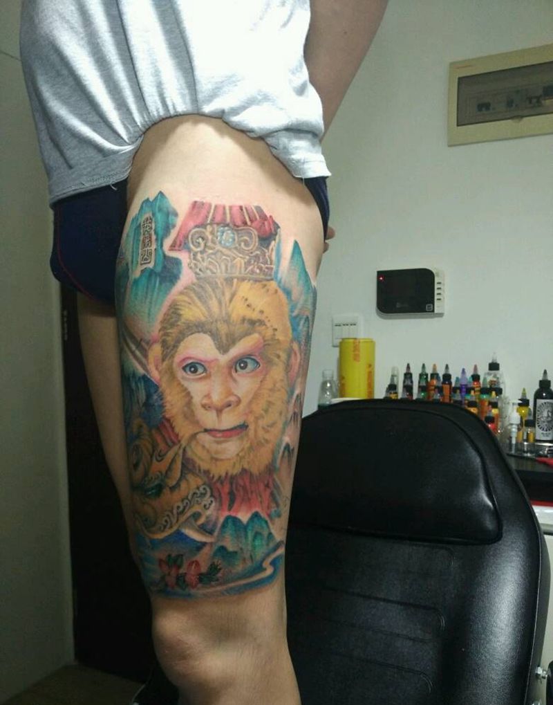 当前位置: 首页 >广东省佛山市纹身店-乐意纹身纹身图案>经典美猴王纹身图片_腿部脚部传统肖像国画人物静物宗教原创成品纹身图案