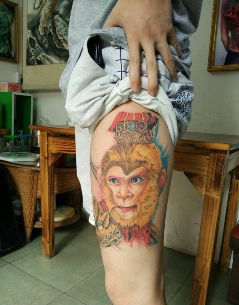 当前位置: 首页 >广东省佛山市纹身店-乐意纹身纹身图案>经典美猴王纹身图片_腿部脚部传统肖像国画人物静物宗教原创成品纹身图案