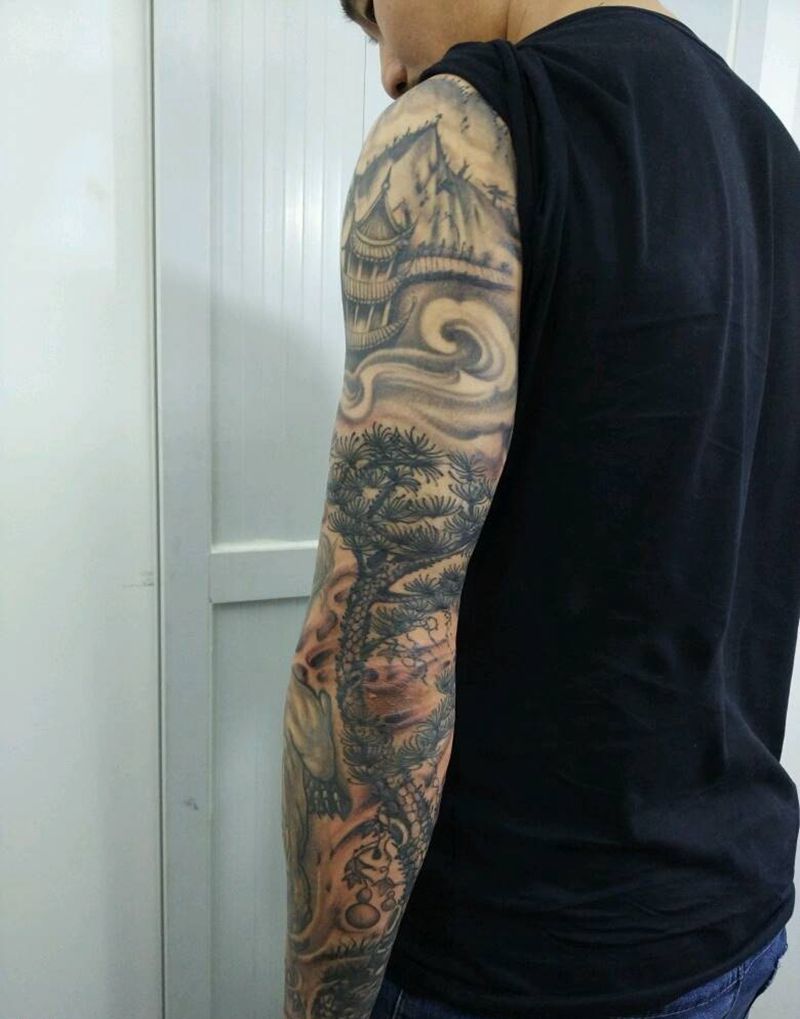 当前位置: 首页 >广东省佛山市纹身店-乐意纹身纹身图案>山水中国风花臂纹身图片_肩部手臂手部传统国画植物静物原创成品纹身图案