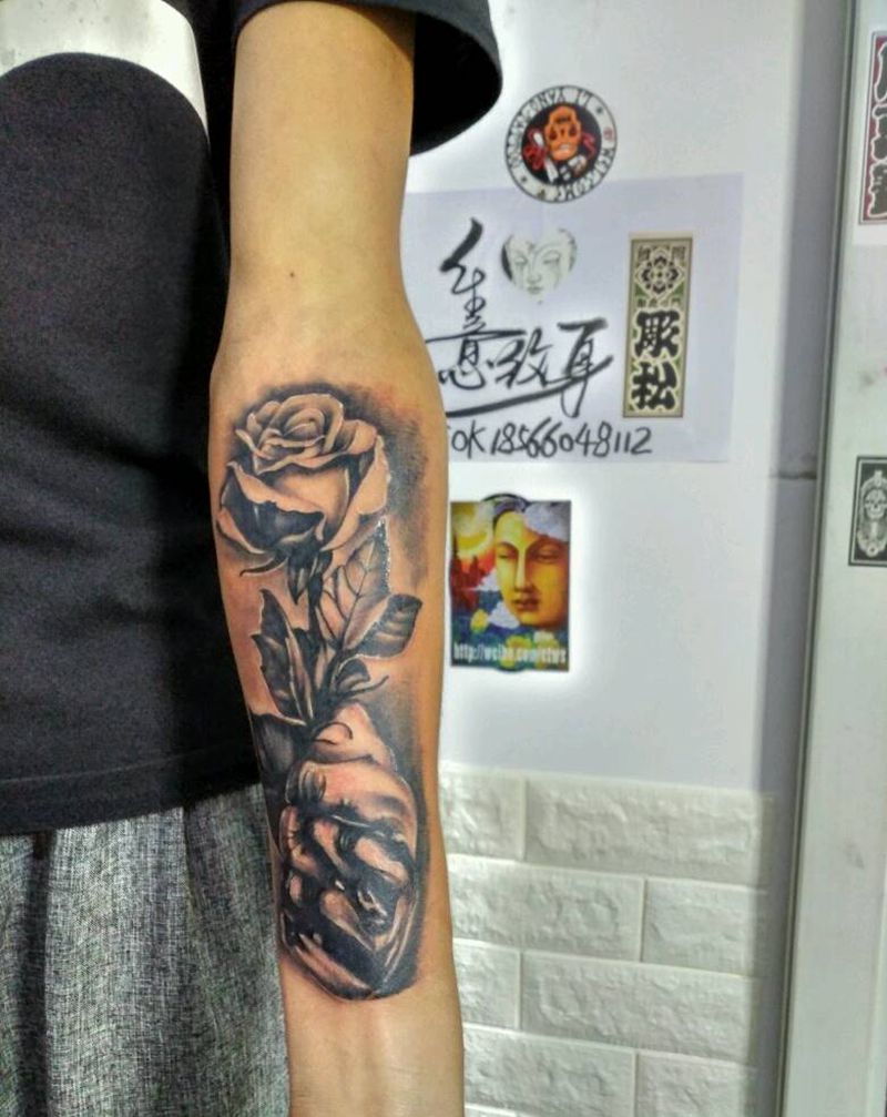 当前位置: 首页 >广东省佛山市纹身店-乐意纹身纹身图案>欧美黑灰写实玫瑰纹身图片_手臂手部欧美写实植物纹身图案