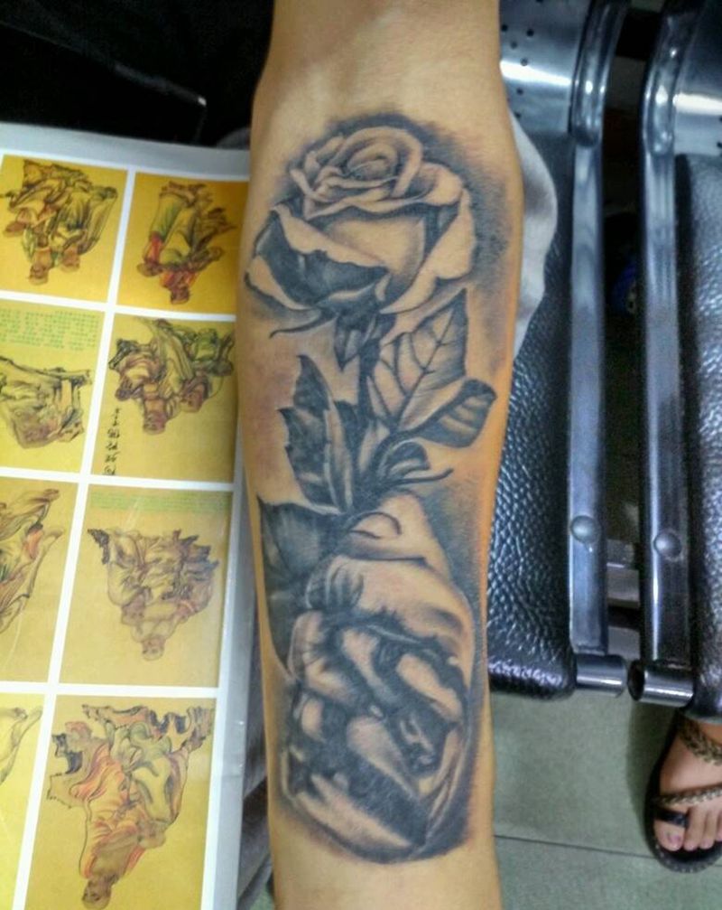 当前位置: 首页 >广东省佛山市纹身店-乐意纹身纹身图案>欧美黑灰写实玫瑰纹身图片_手臂手部欧美写实植物纹身图案