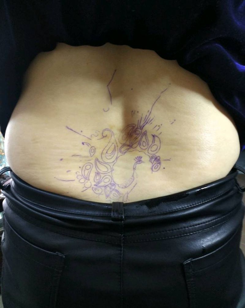 孔雀纹身图片_腰部臀部水彩纹身图案
