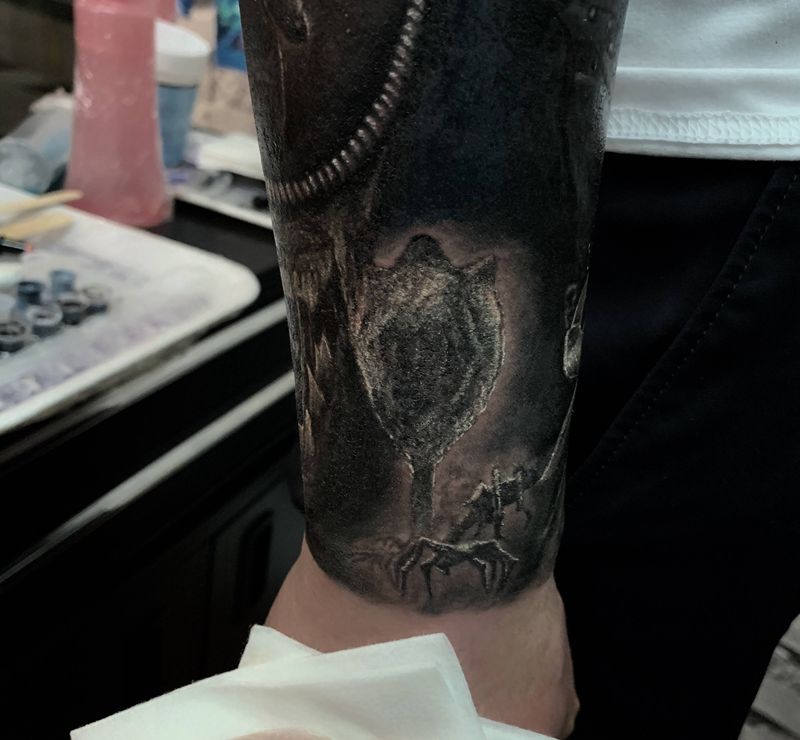 当前位置: 首页 >广东省江门市纹身店-艺行刺道纹身图案>超现实主义·异形纹身图片_手臂手部欧美写实异形纹身图案