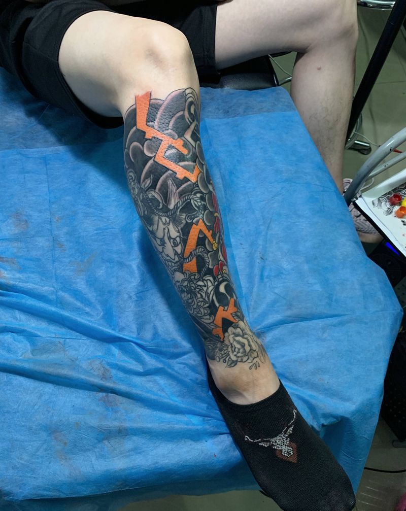 • T网红王老大花腿龙纹身图片_腿部新传统纹身图案