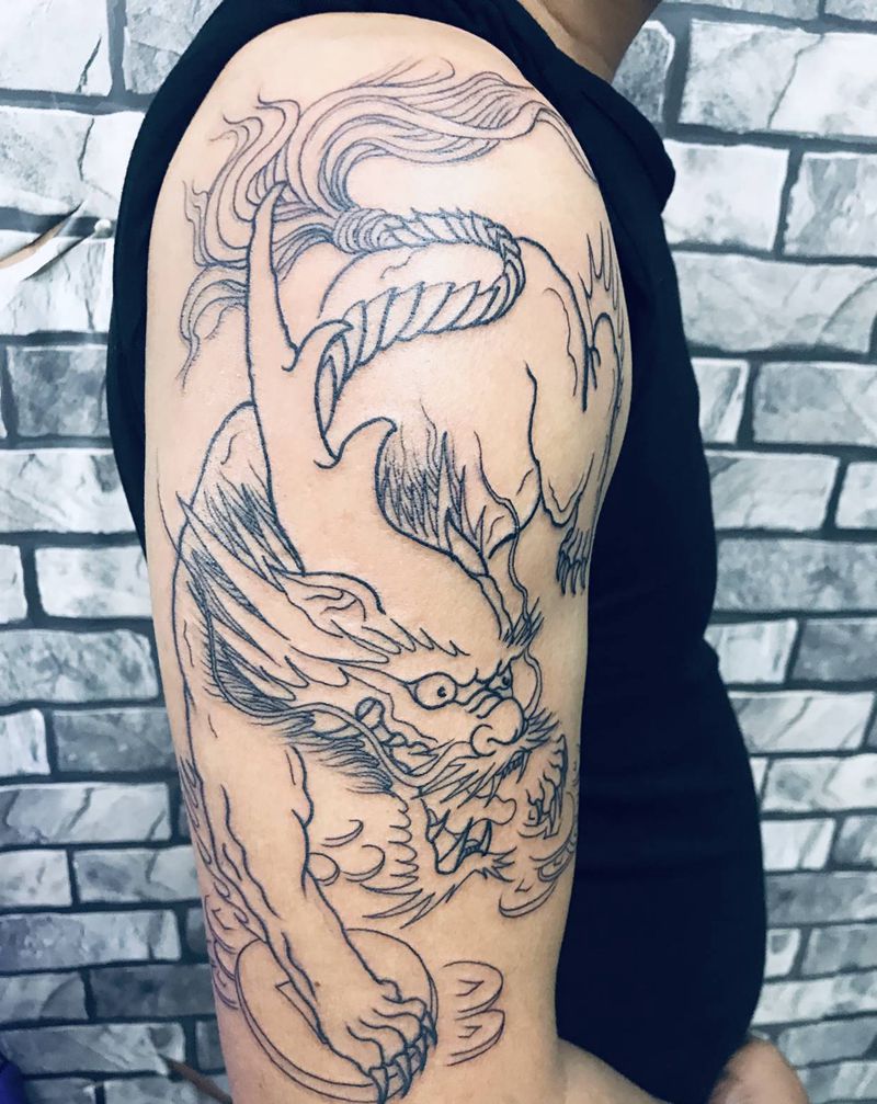 • T网红王老大花腿龙纹身图片_腿部新传统纹身图案