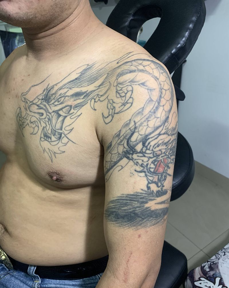 当前位置: 首页 >广东省江门市纹身店-锦绣刺青纹身工作室纹身图案>半甲遮盖(未完)纹身图片_胸部老传统纹身图案