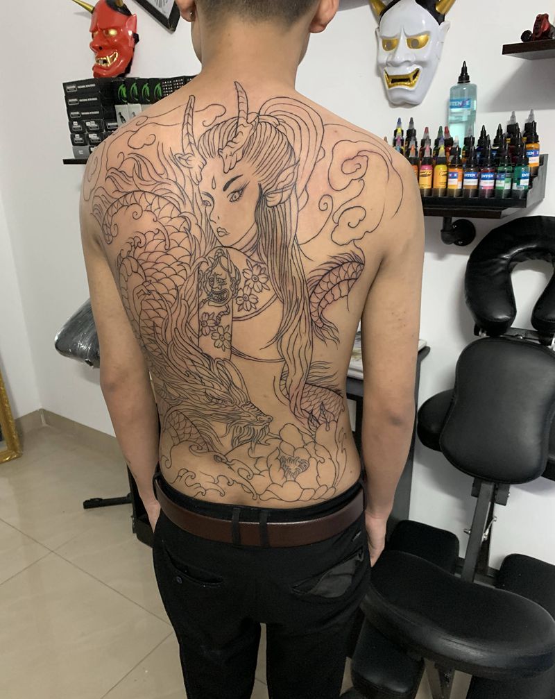 当前位置: 首页 >广东省江门市纹身店-锦绣刺青纹身工作室纹身图案>满背艺伎纹身图片_背部纹身图案