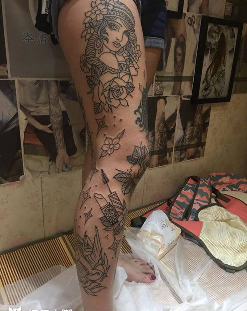 • T网红王老大花腿龙纹身图片_腿部新传统纹身图案