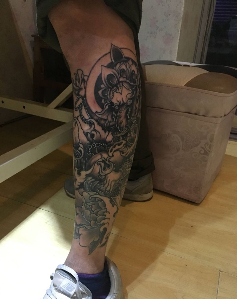 • T网红王老大花腿龙纹身图片_腿部新传统纹身图案