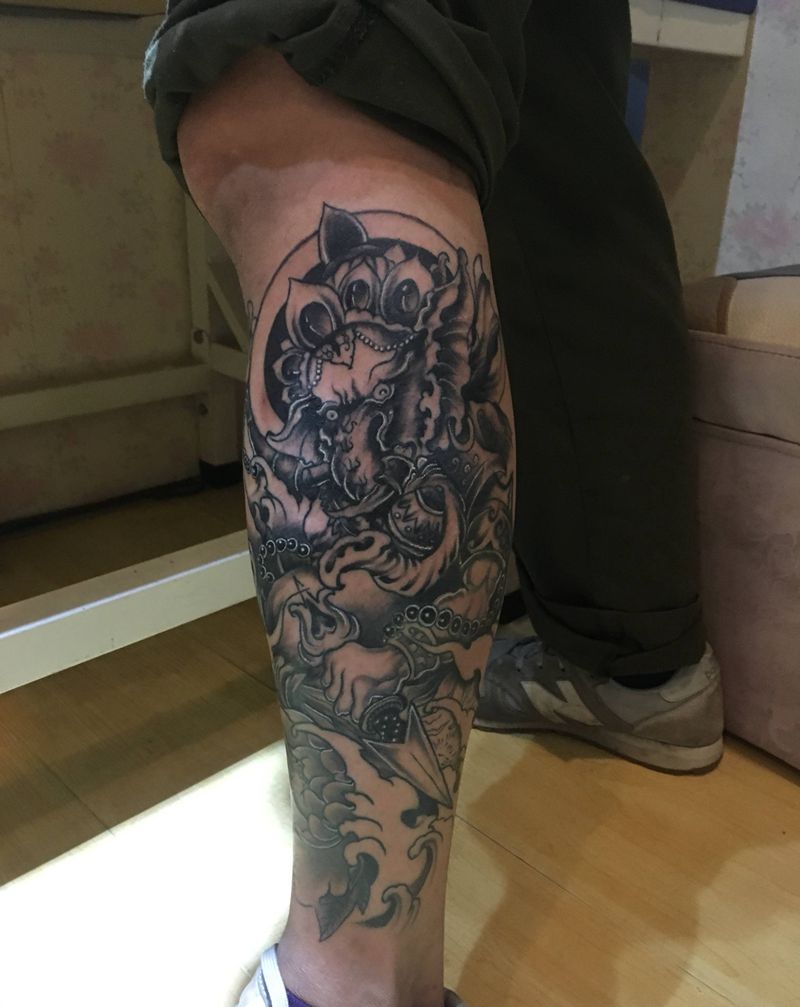 • T网红王老大花腿龙纹身图片_腿部新传统纹身图案