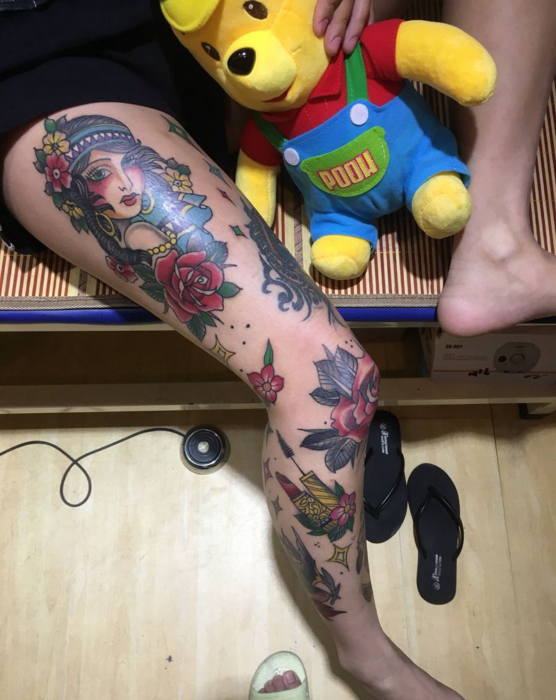 • T网红王老大花腿龙纹身图片_腿部新传统纹身图案