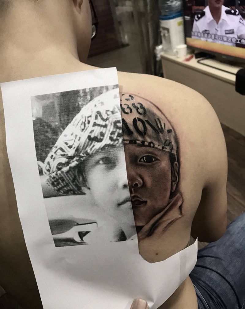 当前位置: 首页 >广东省湛江市纹身店-纹心刺青纹身图案>肖像纹身图片_背部肩部欧美写实新传统纹身图案