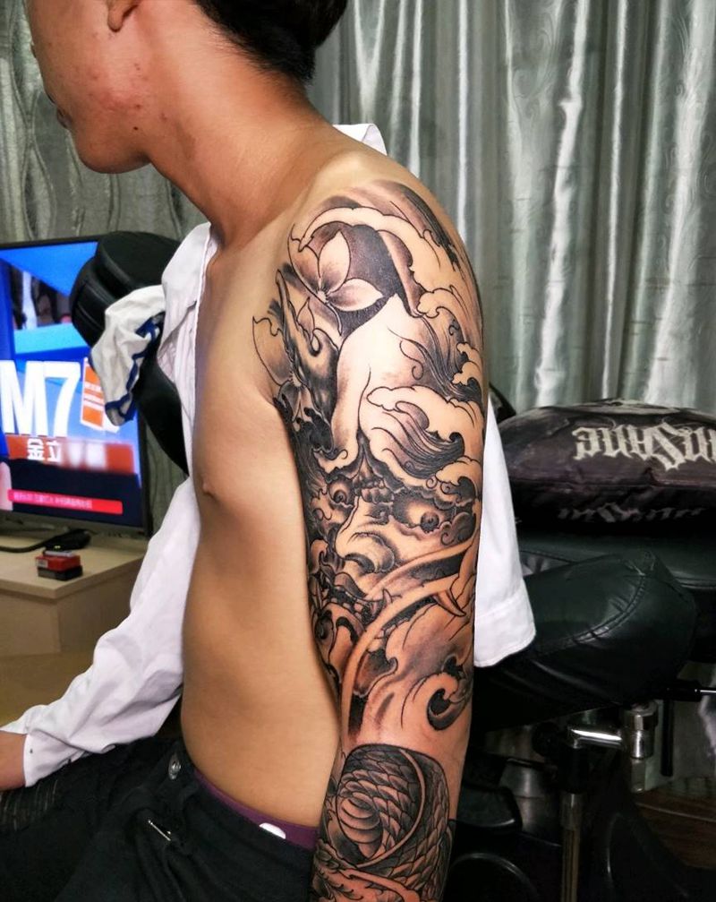 • T网红王老大花腿龙纹身图片_腿部新传统纹身图案