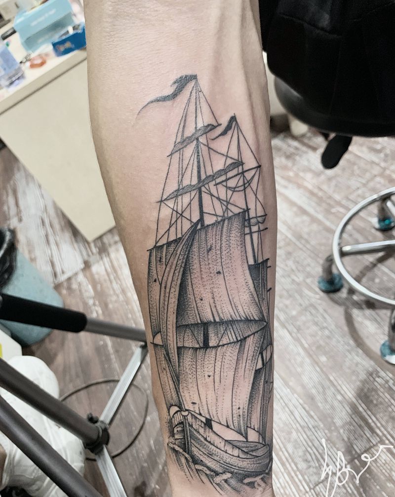 当前位置: 首页 >广东省湛江市纹身店-纹心刺青纹身图案>帆船纹身图片_手臂手部New School点刺纹身图案