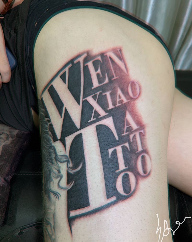 当前位置: 首页 >广东省湛江市纹身店-纹心刺青纹身图案>英文纹身图片_腿部脚部花体字New School大腿纹身图案