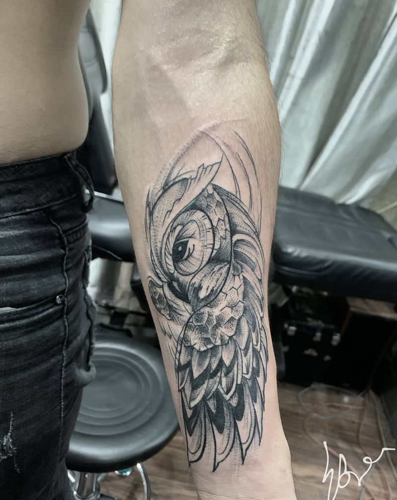 猫头鹰遮盖作品纹身图片_手臂手部新传统点刺纹身图案
