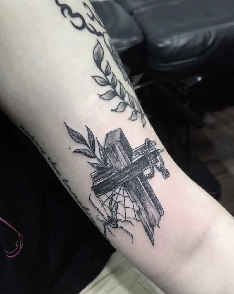 当前位置: 首页 >广东省湛江市纹身店-纹心刺青纹身图案>十字架纹身图片_手臂手部新传统New School纹身图案