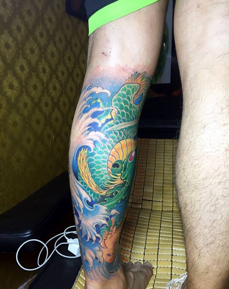 • T网红王老大花腿龙纹身图片_腿部新传统纹身图案