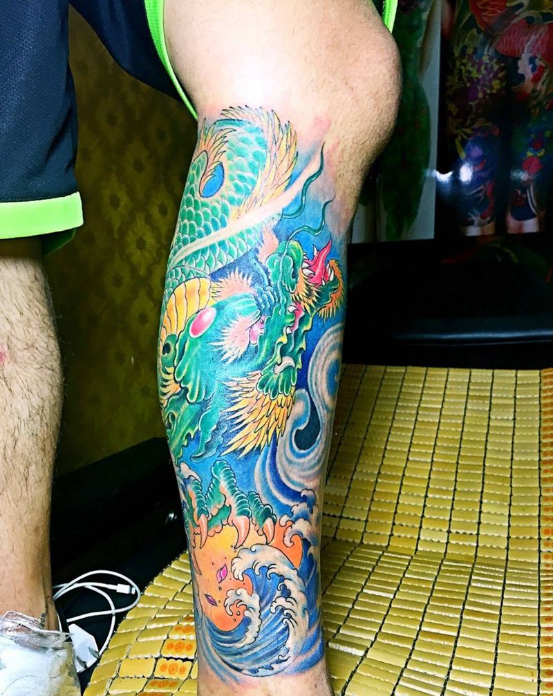 • T网红王老大花腿龙纹身图片_腿部新传统纹身图案