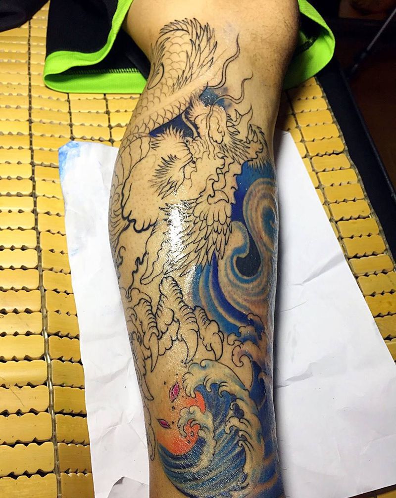 • T网红王老大花腿龙纹身图片_腿部新传统纹身图案