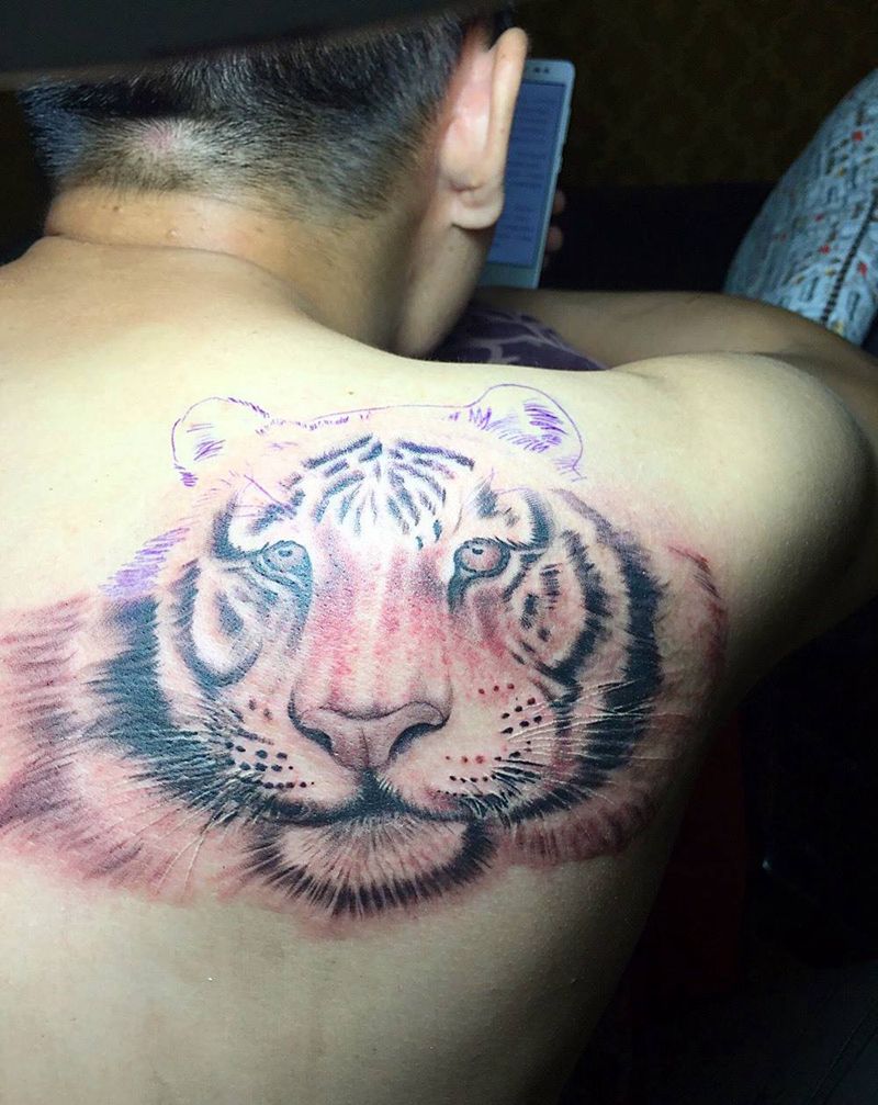当前位置: 首页 >广东省江门市纹身店-茂.刺青纹身图案>虎头纹身图片_背部成品写实动物纹身图案