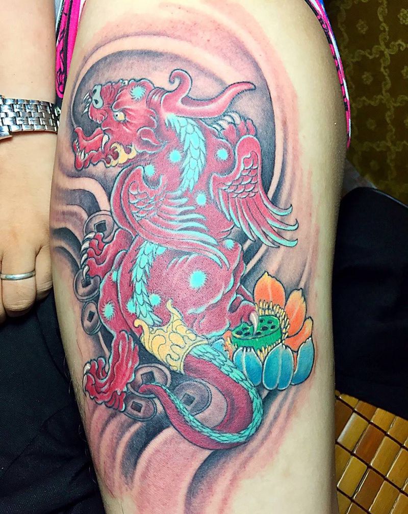 • T网红王老大花腿龙纹身图片_腿部新传统纹身图案