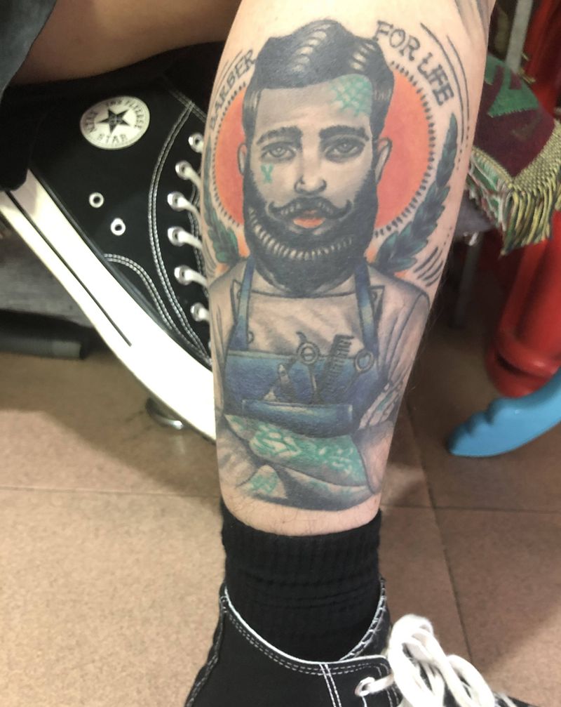 欧美人物 发型师纹身图片_腿部New School欧美写实纹身图案