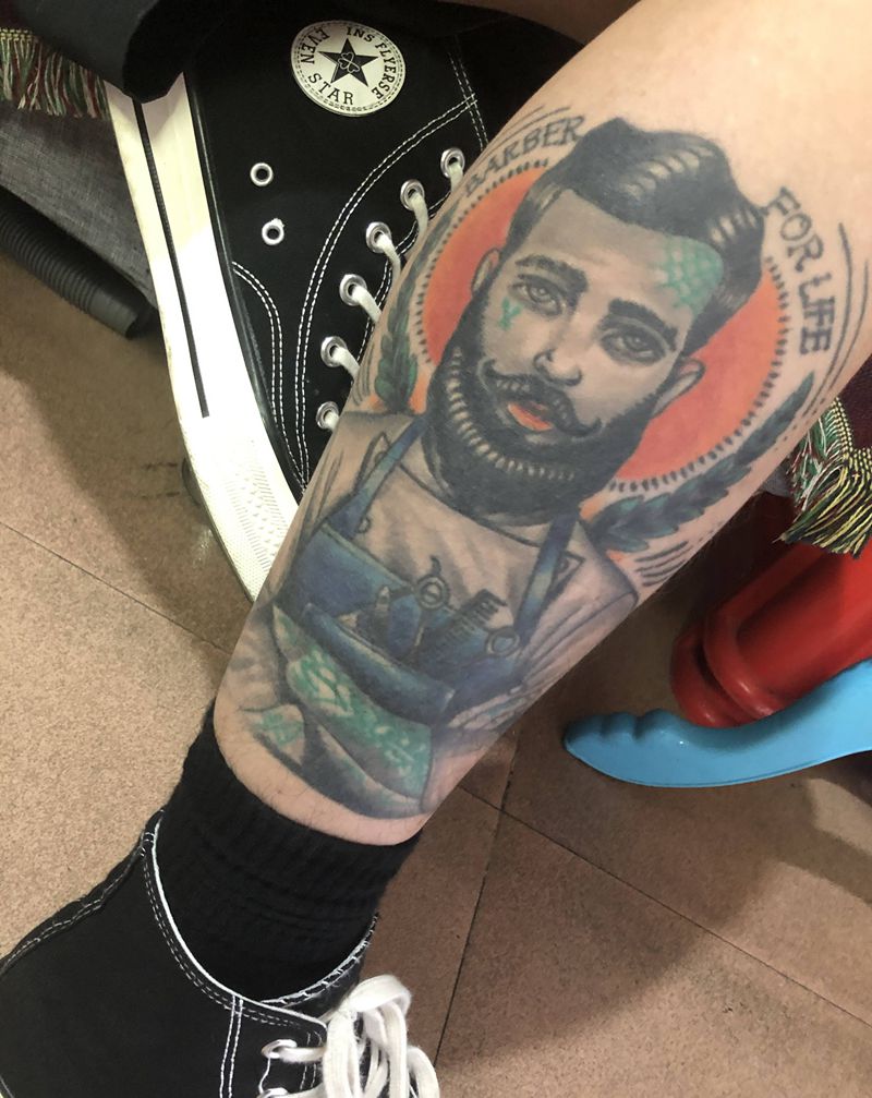欧美人物 发型师纹身图片_腿部New School欧美写实纹身图案