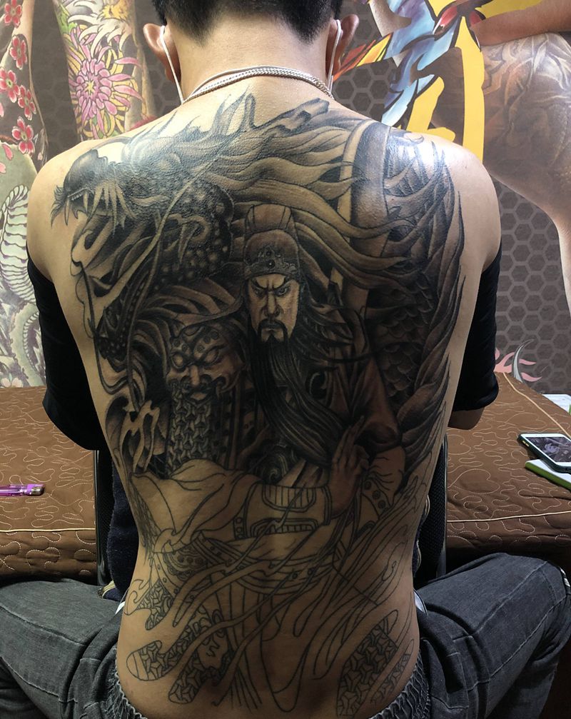 关公御龙(线条非本店)尽力修改纹身图片_背部新传统纹身图案